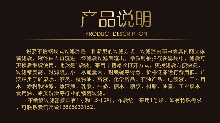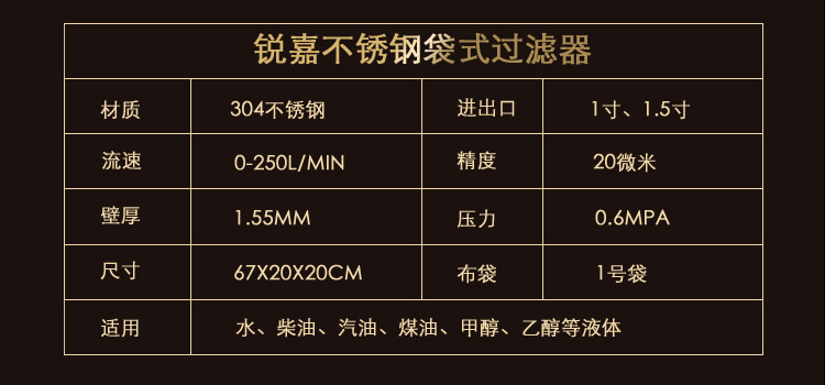 銳嘉柴油過濾器是一種新型的液體過濾器,可過濾水、柴油、酒精等各種液體,布袋統一采用1號,袋如有特殊需求,可聯系我們定做。